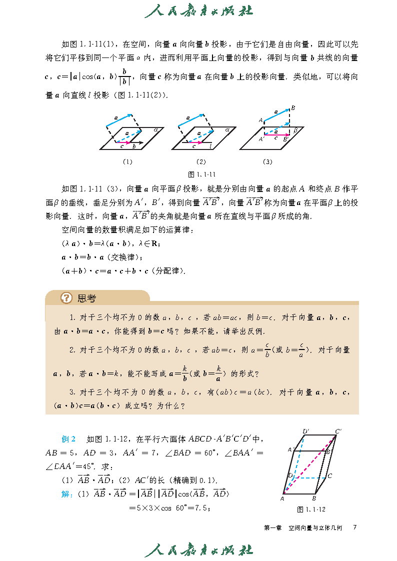- **1.1空间向量及其运算**:主要介绍空间向量的概念、表示方法,以及空间向量的加法、减法、数乘运算和数量积运算等。