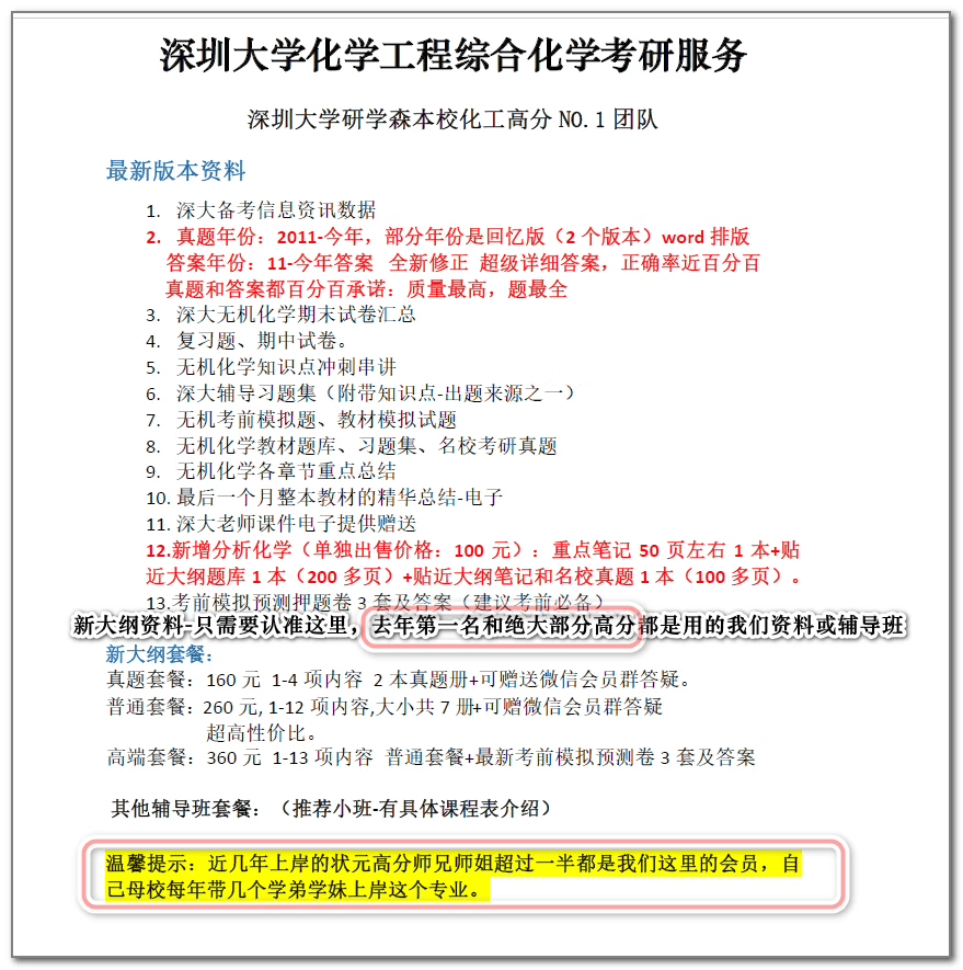 深圳大学化学工程考研初试资料和辅导班服务,务必认准【淘宝:深圳大学考研店铺】,市面资料很多,鱼龙混杂,参差不齐,也有很多假冒、劣质资料,不全资料,盗版旧版资料等,希望可以帮到更多的学弟学妹一次性买到一份更好的资料,提高复习效率,最终帮到大家取得更好的成绩上岸