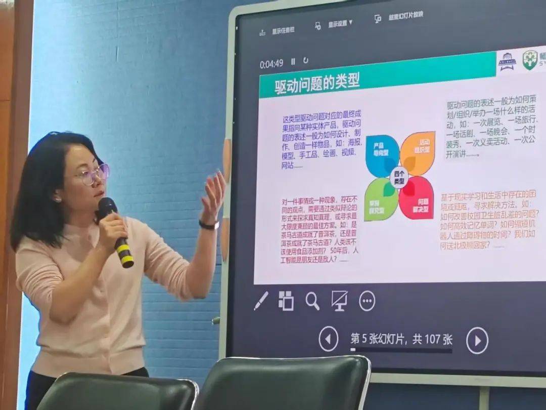 研修以“提升项目式学习的学生参与度”与“优化项目式学习的评价手段”为核心目标,通过理论讲解、案例剖析与互动研讨等方式,帮助教师系统掌握PBL实施策略。石玉娟从项目设计、驱动性问题创设、学生角色定位等维度,详细解析了如何通过情境化任务激发学生自主探究能力,并分享了课堂中常见问题的应对方法。她强调:“PBL的本质是让学习回归真实问题,教师需从‘知识传授者’转变为‘学习引导者’,通过结构化支架帮助学生实现思维进阶。”