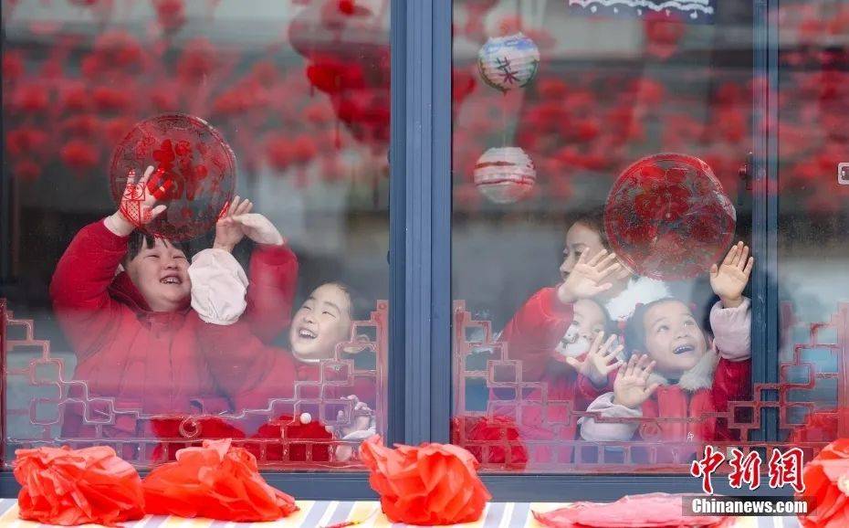 ▲资料图:幼儿园内,小朋友们在老师的指导下贴窗花