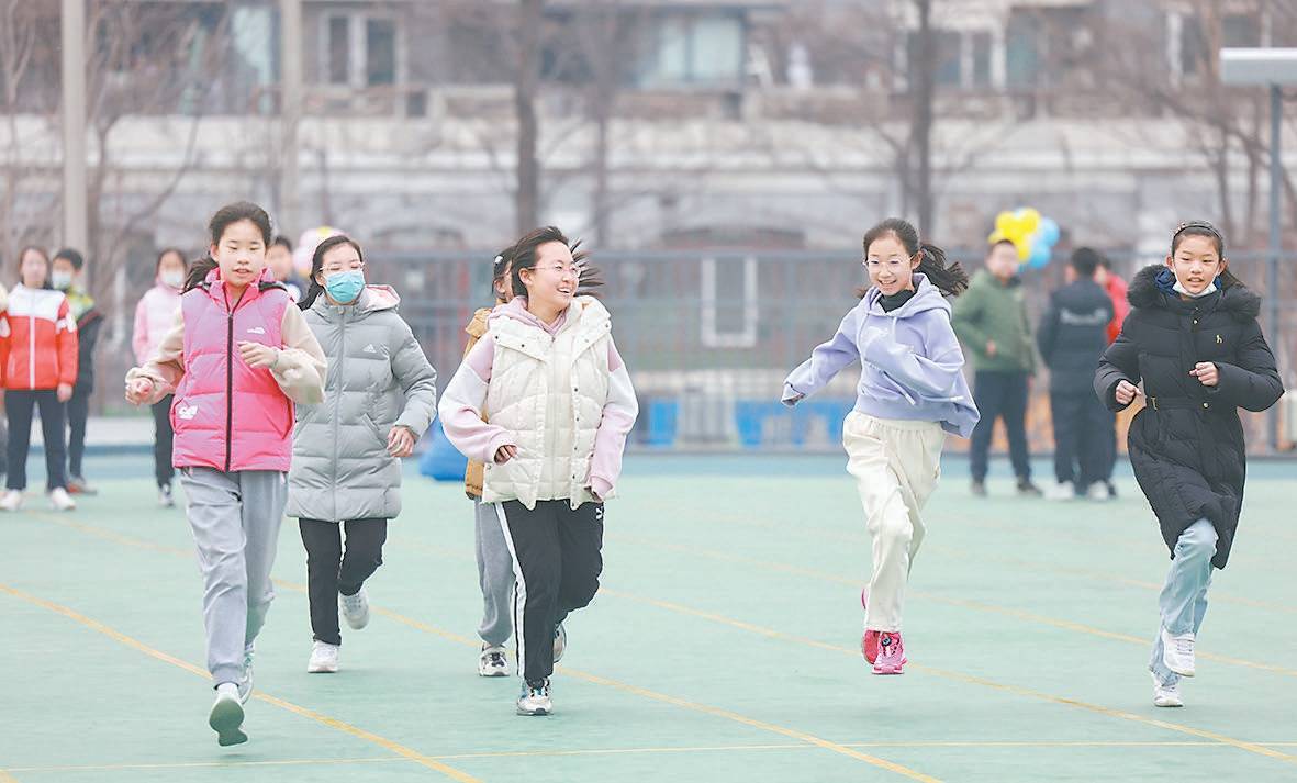 “春城无处不飞花,寒食东风御柳斜……”昨天10时许,欢快的音乐伴着节奏感十足的古诗词朗诵声,从海淀区中关村第一小学的广播里传出来。操场上、教学楼旁,每一处空间都被充分利用,全校近4000名学生以班级为单位,完成折返跑、环形跑等趣味活动。高年级的学生还会跟着老师跑出学校,在校园周边完成更长距离的跑步挑战。