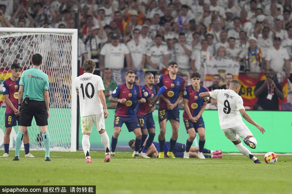 第69分钟,皇马赢得任意球机会,姆巴佩主罚击中左侧立柱弹入球门,1-1!