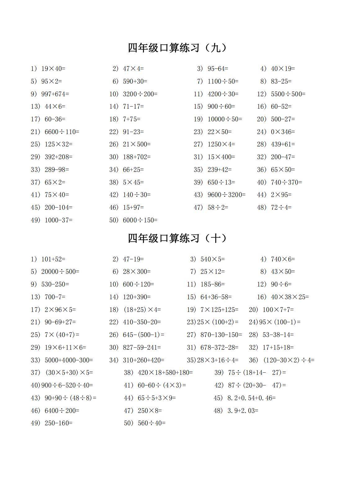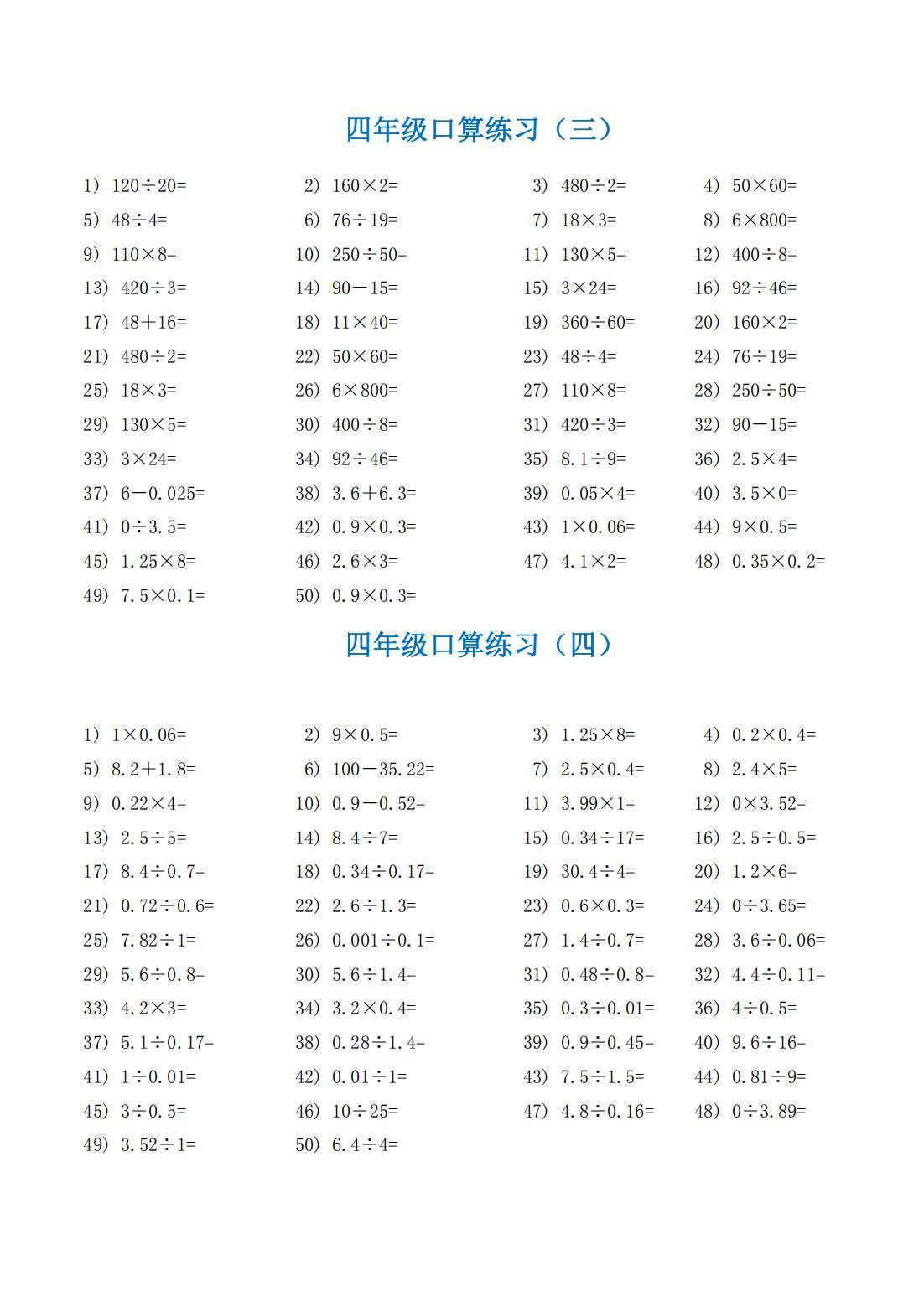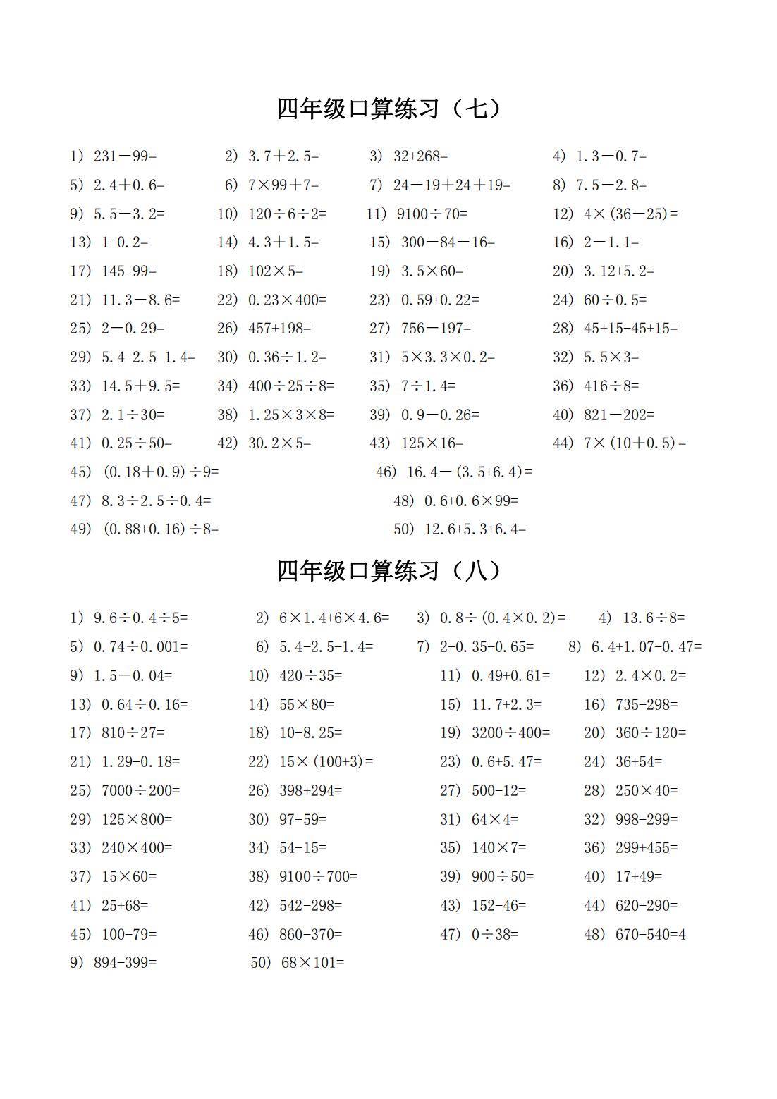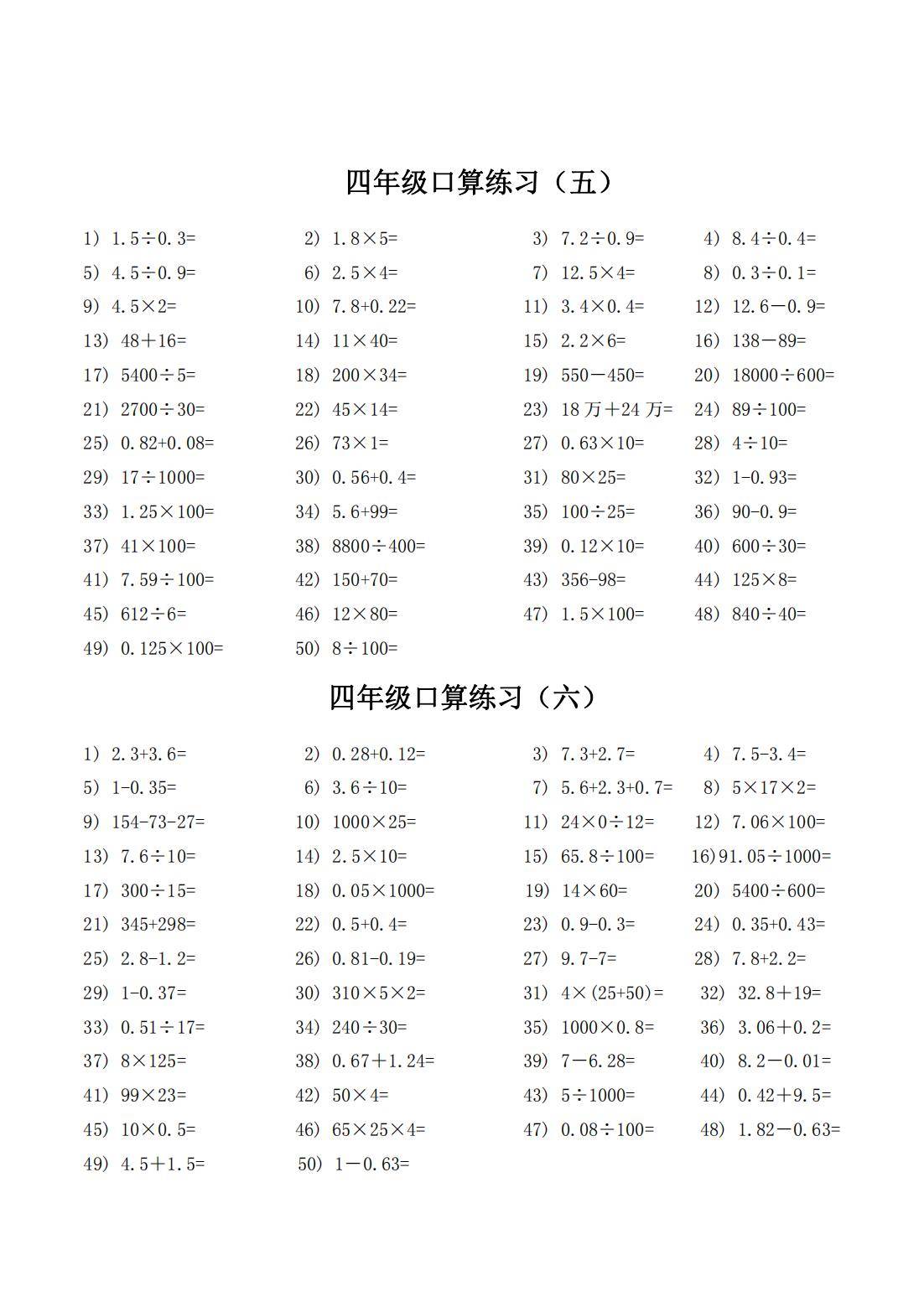 通过反复练习这些口算题,学生能熟练掌握整数和小数的四则运算规则,提高计算的准确性和速度。口算能力的提升有助于学生在数学学习中更高效地解决问题,增强对数学运算的敏感度和自信心。长期坚持练习,还能培养学生的思维敏捷性,为后续更复杂的数学学习奠定坚实基础 。