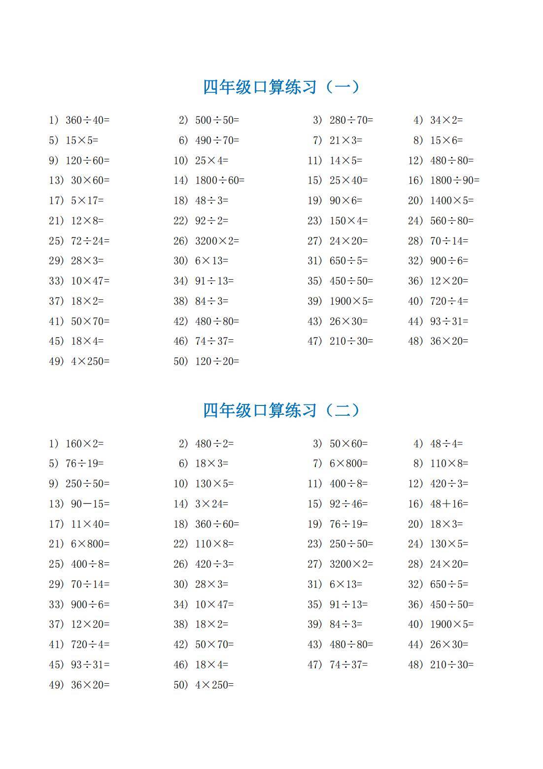今天为大家分享:【口算练习题】四下数学,包含多组口算题目。内容涵盖整数的乘除法,如 360÷40、15×5\)等;整数的加减法,像 90 - 15、48 + 16 等;还有小数的四则运算,例如 8.1÷9、2.5×4 等。题目形式为单纯的算式计算,旨在训练学生的口算能力。