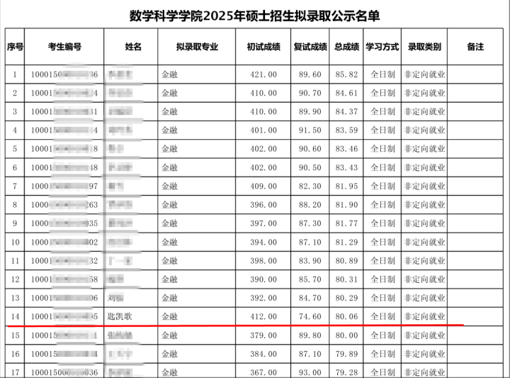 据北大数院发布于今年4月3日的《数学科学学院2025年硕士招生拟录取公示名单》显示,该名单序号第14为匙凯歌,拟录取专业为金融,学习方式是全日制,非定向就业。