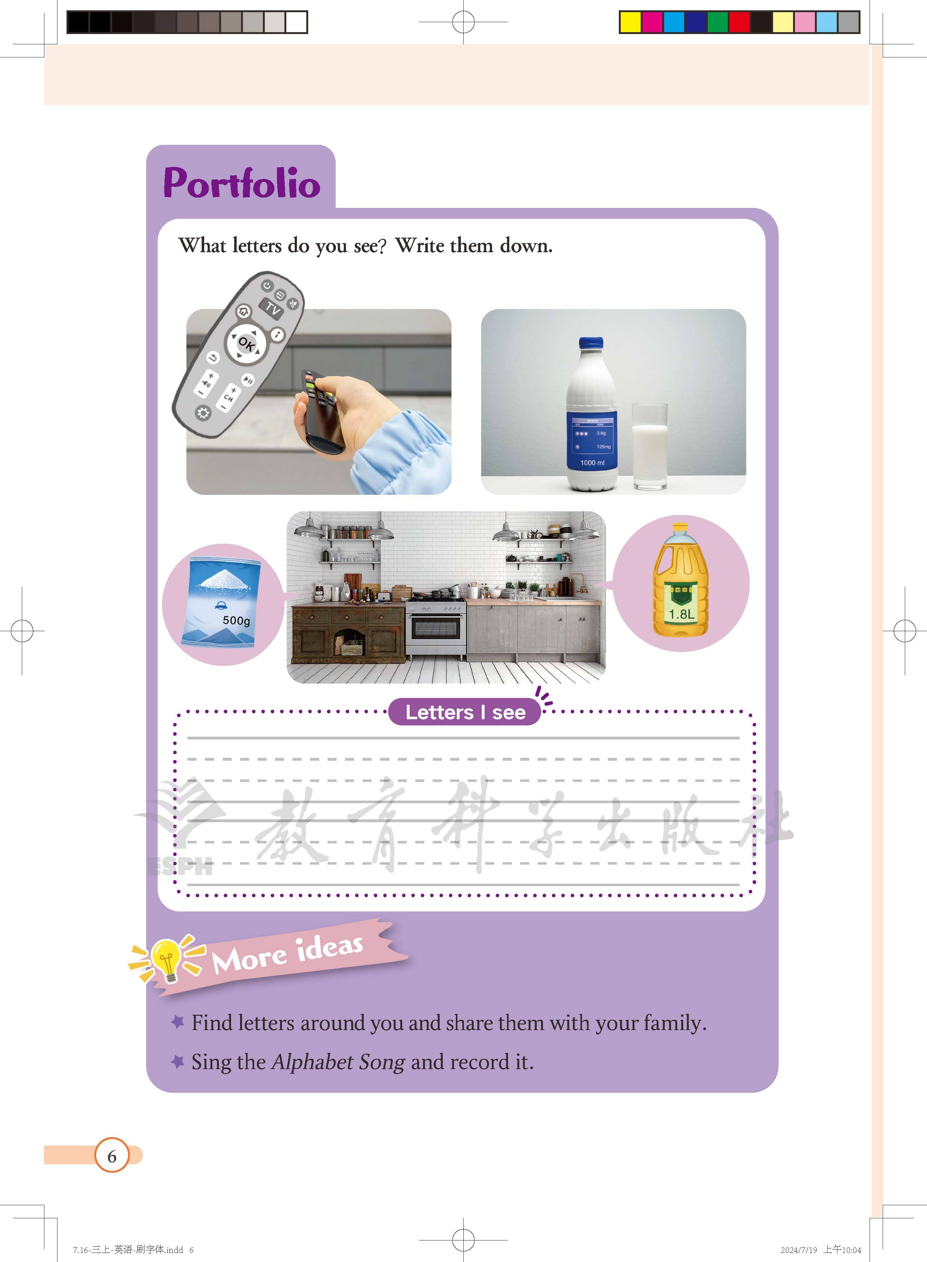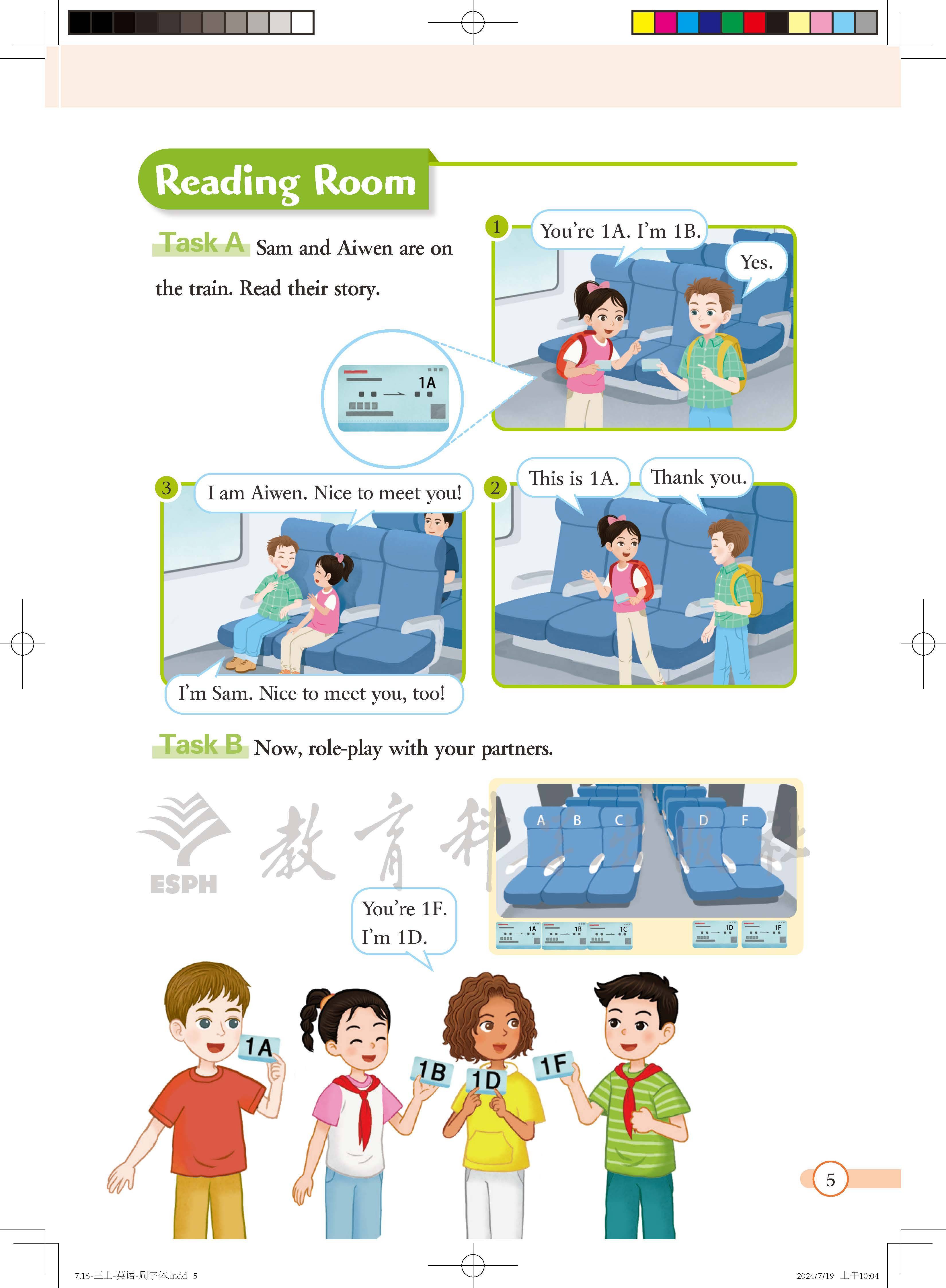 - Part A:包含三个页面,第一个页面是对话(Let's talk),三年级的对话包括 2-4 个话轮,主要用于基于主题意义进行听说实践活动,运用核心功能句进行表达和交流等;第二个页面是词汇(Let's learn)板块,依次呈现单词、语块、简单句、组句,并配有歌谣、TPR 活动、游戏等来巩固学习词汇;第三个版块为 Letters and Sounds,主要学习字母的音、形、序,字母本身的发音、字母在单词中的发音,且增加了单词拼读,让学生尝试拼读 CVC 结构的单词。