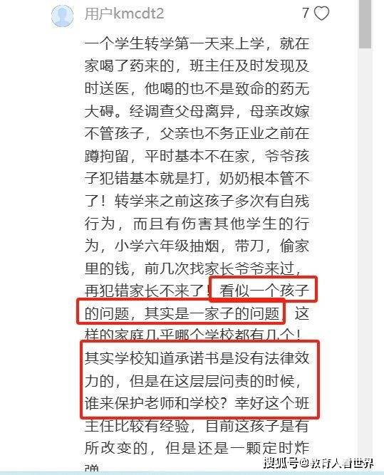 网友就提供了不少这样的案例。如网友举例,一个学生转学第一天来上学,就在家喝了药,班主任及时发现及时送医,他喝的也不是致命的药无大碍。经调查父母离异,母亲改嫁不管孩子,父亲也不务正业之前在蹲拘留,平时基本不在家,爷爷孩子犯错基本就是打,奶奶根本管不了!转学来之前这孩子多次有自残行为,而且有伤害其他学生的行为,小学六年级抽烟,带刀,偷家里的钱,前几次找家长爷爷来过,再犯错家长不来了!看似一个孩子的问题,其实是一家子的问题,这样的家庭几乎哪个学校都有几个!