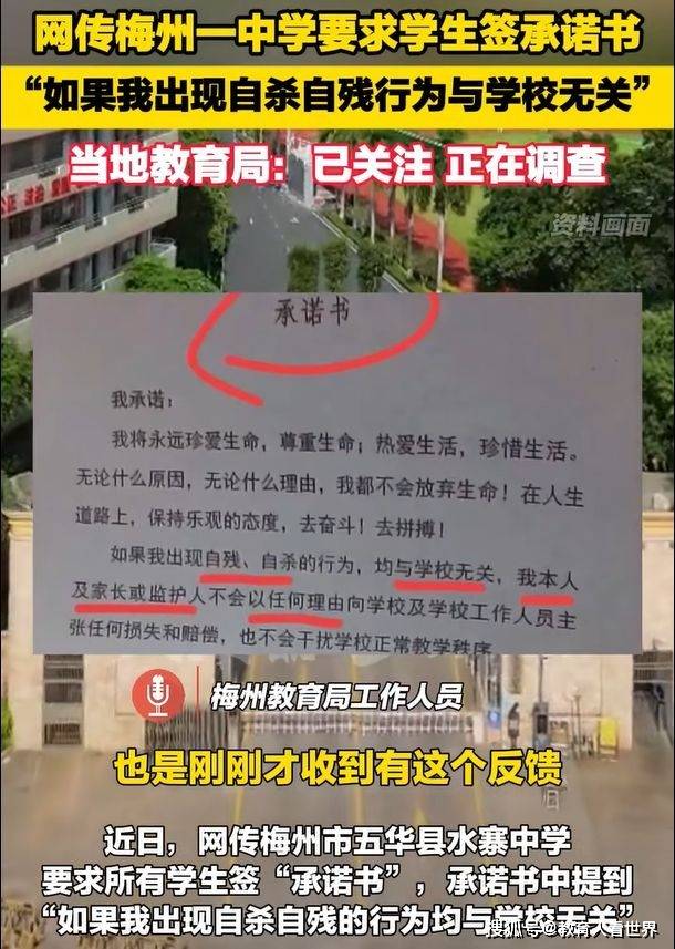 近日,梅州市五华县水寨中学要求学生签订“珍爱生命承诺书,引起广大网友关注。
