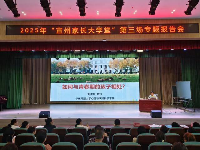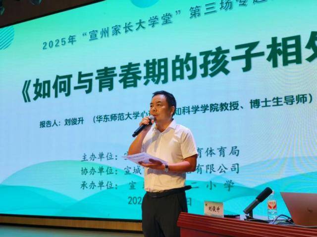 6月21日上午,2025年“宣州家长大学堂”第三场专题报告会在宣城市第二小学报告厅举行。华东师范大学心理与认知科学学院教授、博士生导师刘俊升受邀作《如何与青春期的孩子相处》主题报告,来自宣城市实验小学梅溪校区、第二小学、第九小学及第六中学、第八中学、奋飞学校6所学校的300余名家长现场聆听。