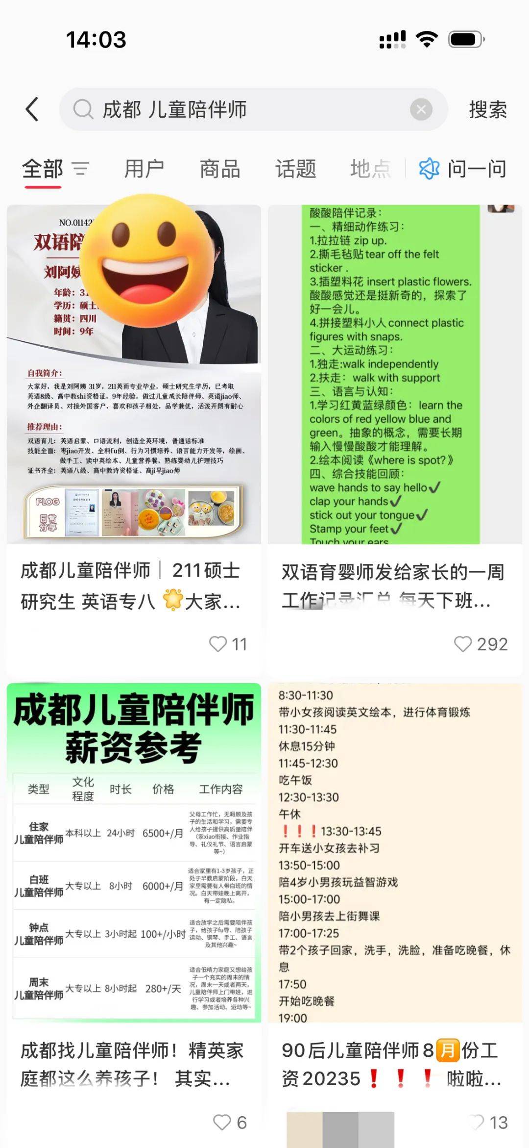 《2023中国家庭教育现状报告》显示,中国双职工家庭占比已达82%,父母平均每天陪伴孩子时间不足1.5小时。但家长对于“高质量亲子陪伴的需求”只增不减。于是,社交平台上不断地涌现出大量关于“儿童陪伴师”招聘与求职信息。