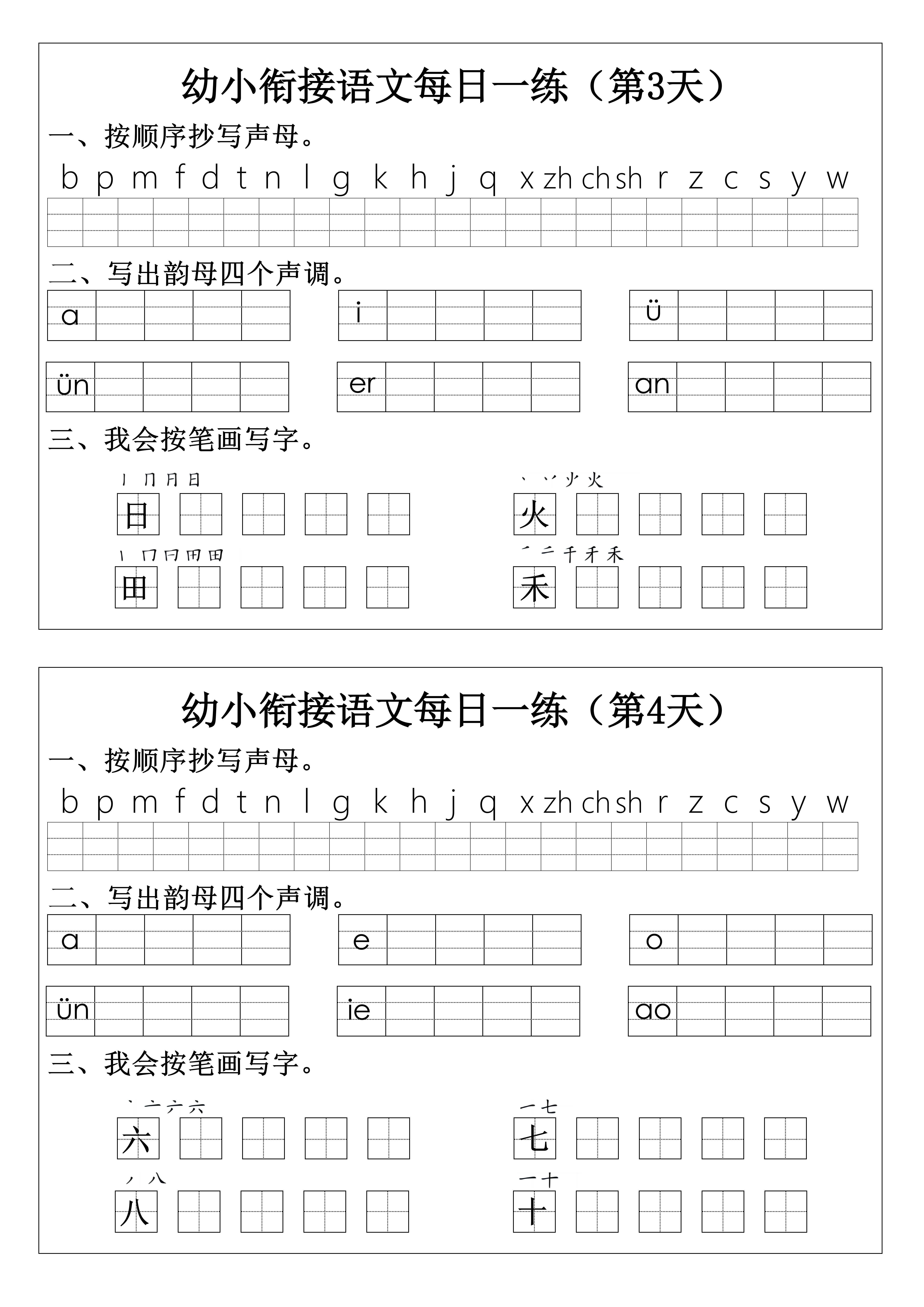 今天为大家分享:幼小衔接语文拼音生字每日一练24天12页,围绕拼音与汉字基础展开。包含声母抄写、韵母四声调书写,还有按笔画写字练习,覆盖简单汉字,从拼音认读规范到汉字笔画书写,是为学前儿童过渡小学一年级设计的基础训练,帮孩子提前熟悉语文学习的基本内容,做好入学准备 。