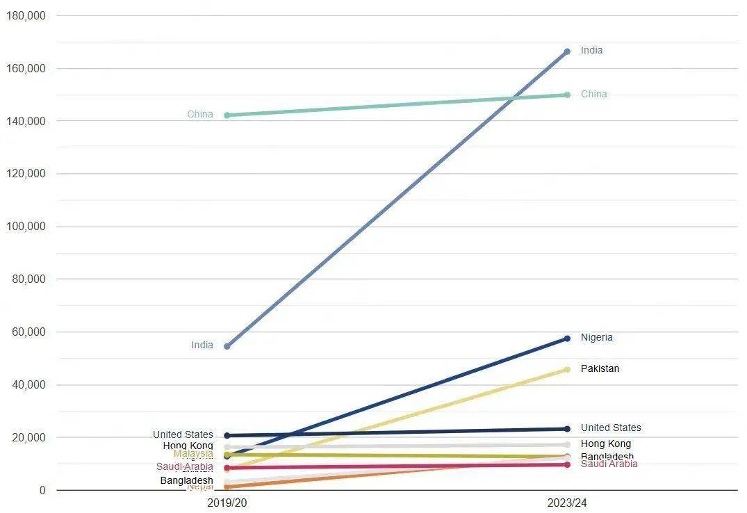 2025申请季,英国大学本科总申请数达到了665,070份。其中中国学生增长幅度达到10%,共有33,870分,依旧是榜首。