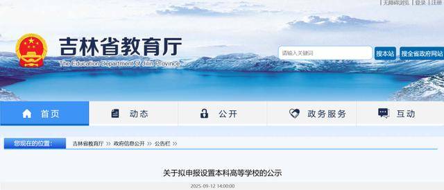 9月12日,吉林省教育厅发布关于拟申报设置本科高等学校的公示,具体如下: