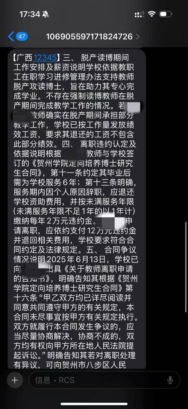 澎湃新闻注意到,在12345回复中,贺州学院称,2022年,贺州学院划归自治区管理,修订了《贺州学院教职工在职学习进修管理办法》,新办法第十九条规定“教职工在职攻读博士、硕士等学历教育费用原则上个人自理,学校不再办理相关借支与报账业务”,新办法自2023年1月1日起执行,原办法同时废止、学校已通过座谈会向在读人员解释政策变化,不存在违约行为。此外,贺州学院不存在强制读博教师在脱产期间完成教学工作的情况,若夏荷确实在脱产期间承担了部分教学工作,学校已按照工作量发放绩效工资,要求其退还的工资不包含此部分绩效。