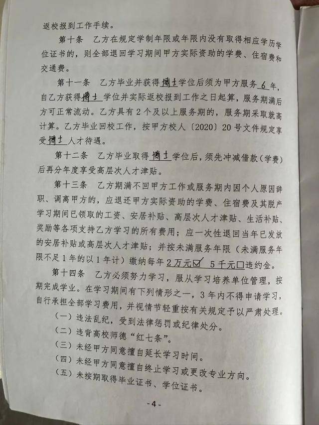 读博前,夏荷和贺州学院签订的《贺州学院定向培养博士研究生合同》约定,夏荷获得博士学位后,需为贺州学院服务6年,服务期满后方可正常流动,若违约需退还贺州学院相关费用并支付违约金。