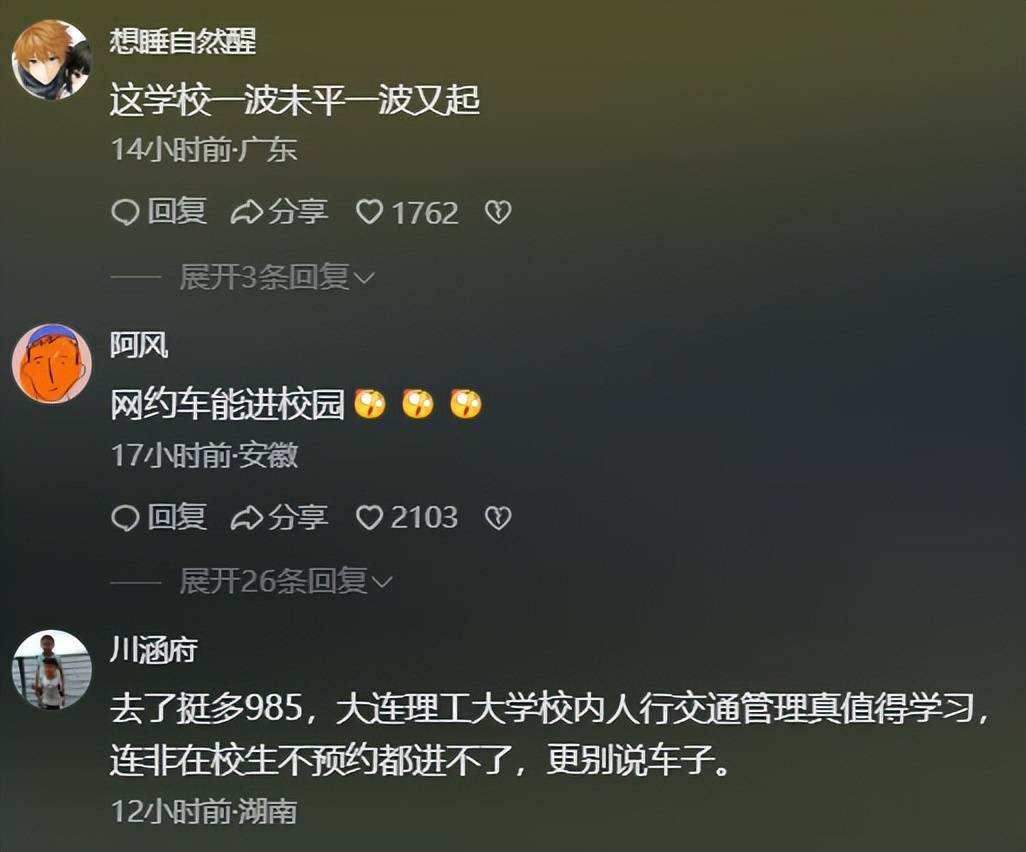 还有网友说:去了挺多985,大连理工大学校内人行交通管理真值得学习,连非在校生不预约都进不了,更别说车子。
