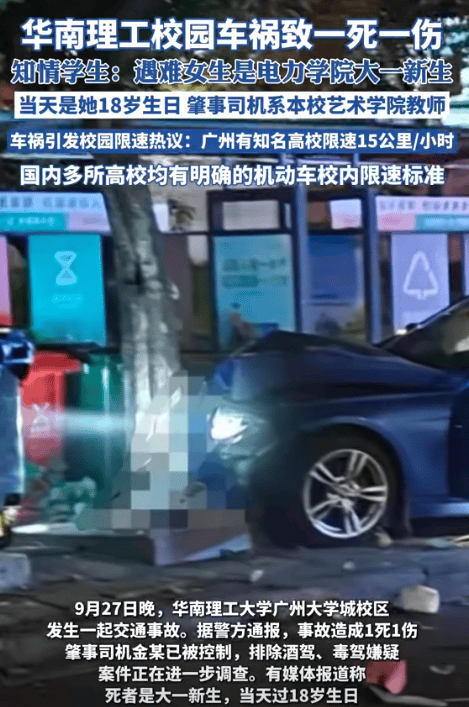 华南理工大学这所985高校,校内车祸造成1死1伤的事情,大家基本上都知道了,该校艺术系的一名老师驾车撞死了一名该校电气工程的新生,而该新生当日恰好是她的生日。另一名受伤的女生则也是艺术系的女生。