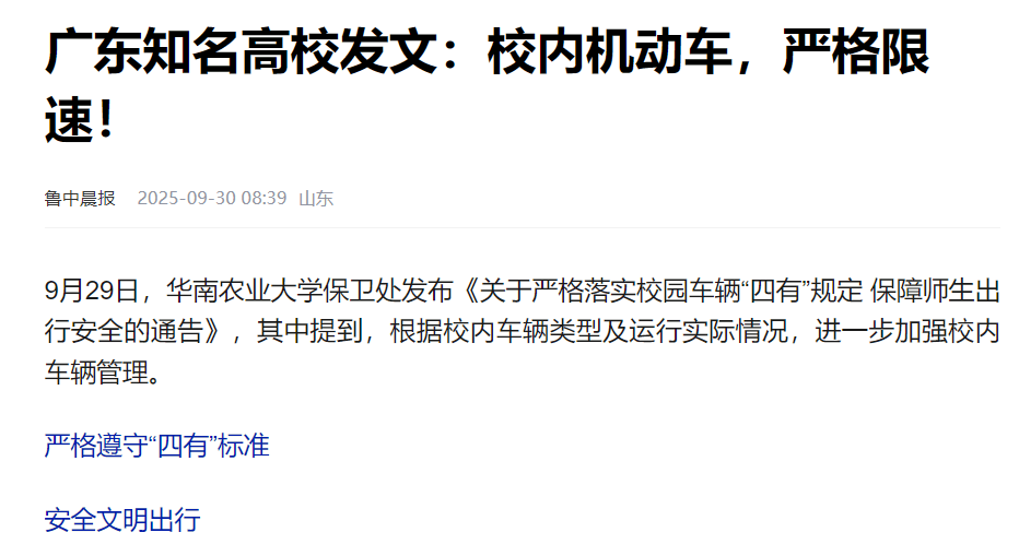 在华南理工大学发生事故后,华南农业大学又再次强调了限速。9月29日,发布《关于严格落实校园车辆“四有”规定 保障师生出行安全的通告》,其中要求校内机动车按30公里/小时严格限速,电动自行车严格限速25公里/小时,严禁这些车辆超速、超载……