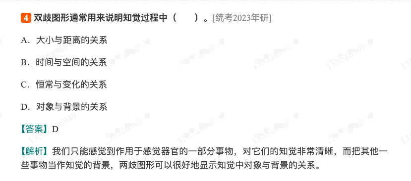 ①理解帮助对象从背景中分离出来。在“杯子一人脸”的双歧图形中,如果我们事先知道它是一只杯子,那么图形的中间部分就容易成为知觉的对象,并且使我们对它的知觉保持相对的稳定性;如果我们事先知道它是一张侧面的人头,那么图形的两侧就容易成为知觉的对象,而中间部分成为知觉的背景。