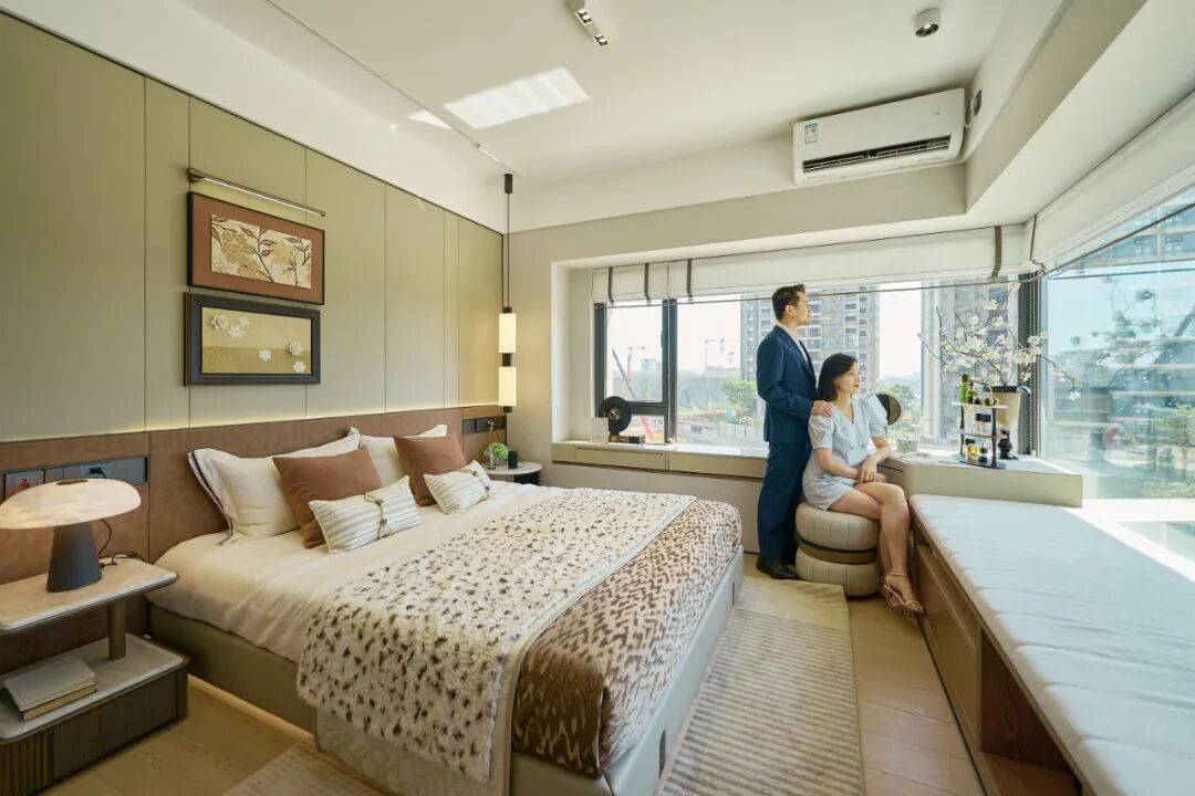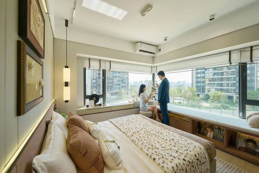 目前,四期新规全线户型实用率超120%,还有入户花园、全景飘窗的设计以及高效收纳系统的整合。主卧采用的270°全景舱设计,提供了无遮挡的公园视野。