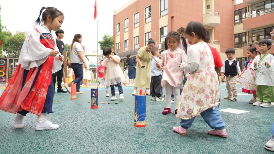 “玉兔吃月饼” 游戏中,孩子们拿着月饼形状的小球,在规定的白线后将“月饼”抛掷网中,脸上满是专注;“跳竹竿” 游戏充满童趣,孩子们跟着竹竿的节奏踏步,笑声此起彼伏;“投壶”游戏里,孩子们站在指定位置,将箭投入壶中,体验古人的娱乐方式,感受传统游戏的魅力。此外,“击鼓骑马”“摸秋” “童声颂祖国”等游戏也各具特色。孩子们在游戏中收获快乐,在互动中传承中华优秀传统文化。