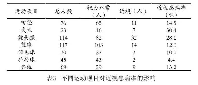 福建师范大学体育学学院曾随机抽取了该校体育学院500名学生进行视力调查发现,参加乒乓球运动后近视患病率最低为4.4%,其次是羽毛球运动为10.1%,篮球(近视患病率12.0%)。