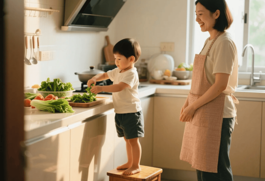 如果孩子感兴趣,邀请TA当"厨房小帮手",一起洗菜、摆碗筷。