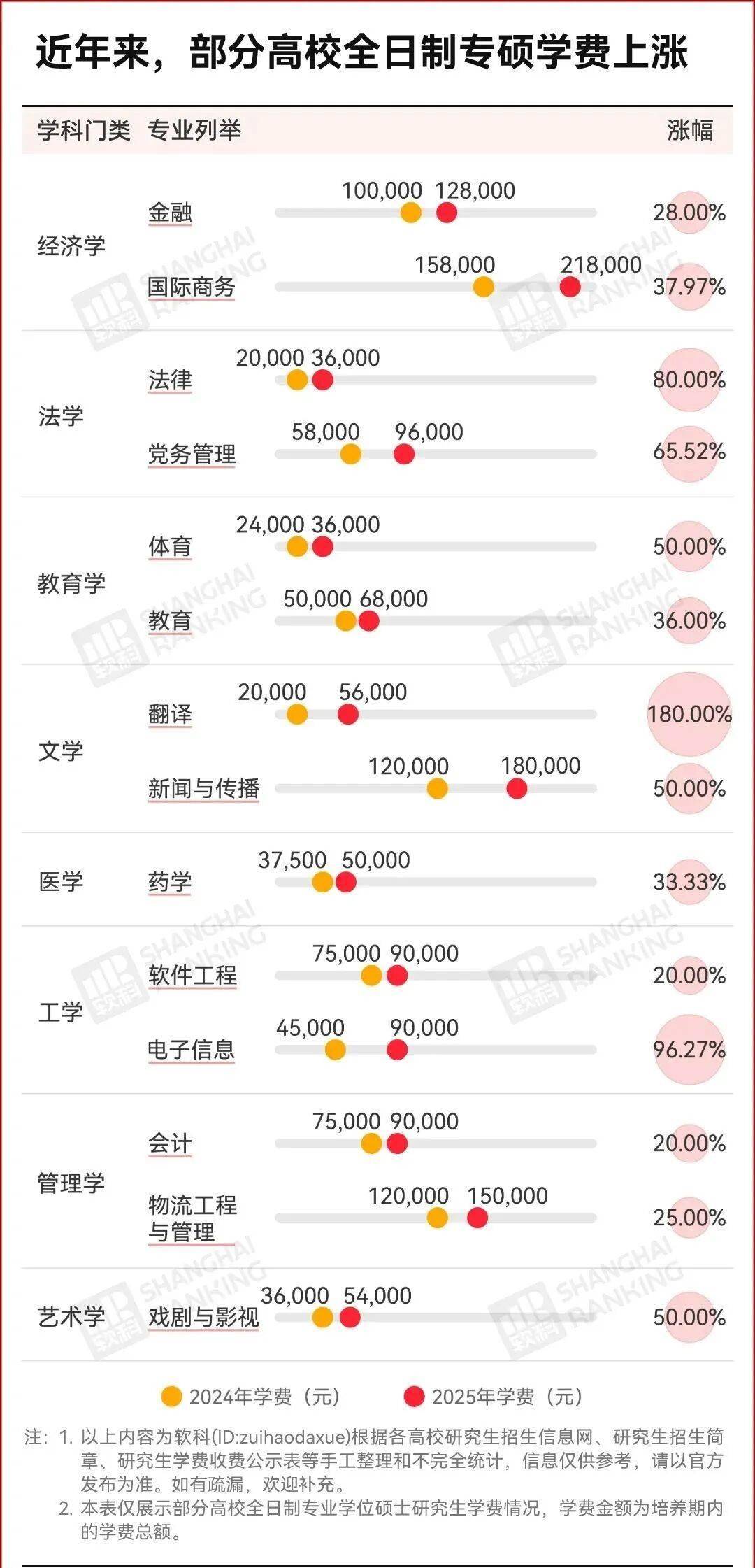 如果说读什么专业最“花钱”, 经管类专硕绝对榜上有名, 本就高昂的学费在今年又迎来一波上涨。某C9高校 金融、保险、税务、应用统计全日制专硕的学费总额,从去年的21.8万涨到25.8万,涨幅达到18%。某财经大学25级 会计专硕的数据分析与财务决策方向,也从原本的6.8万元/2年,一跃提升至9.8万元/2年,涨幅高达44%。