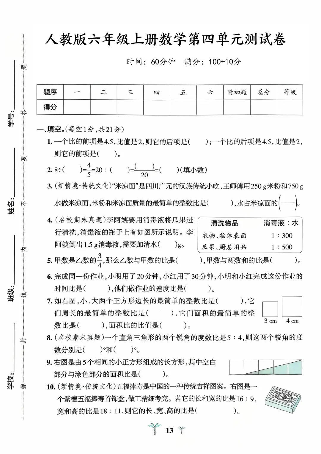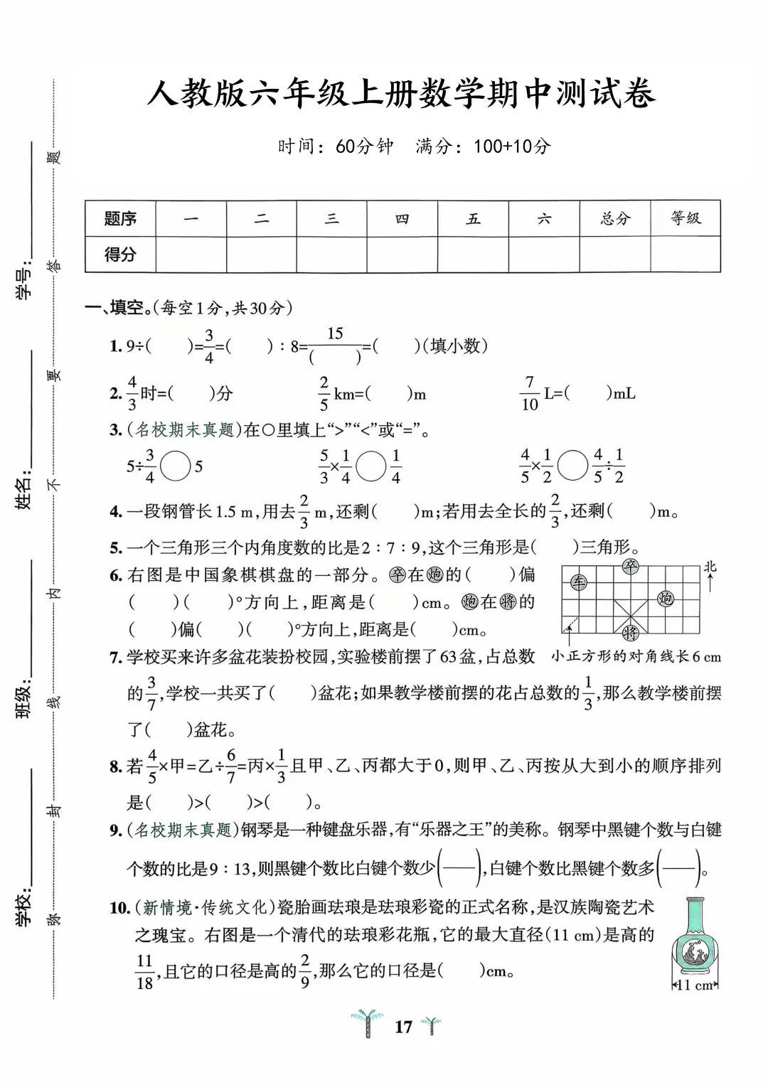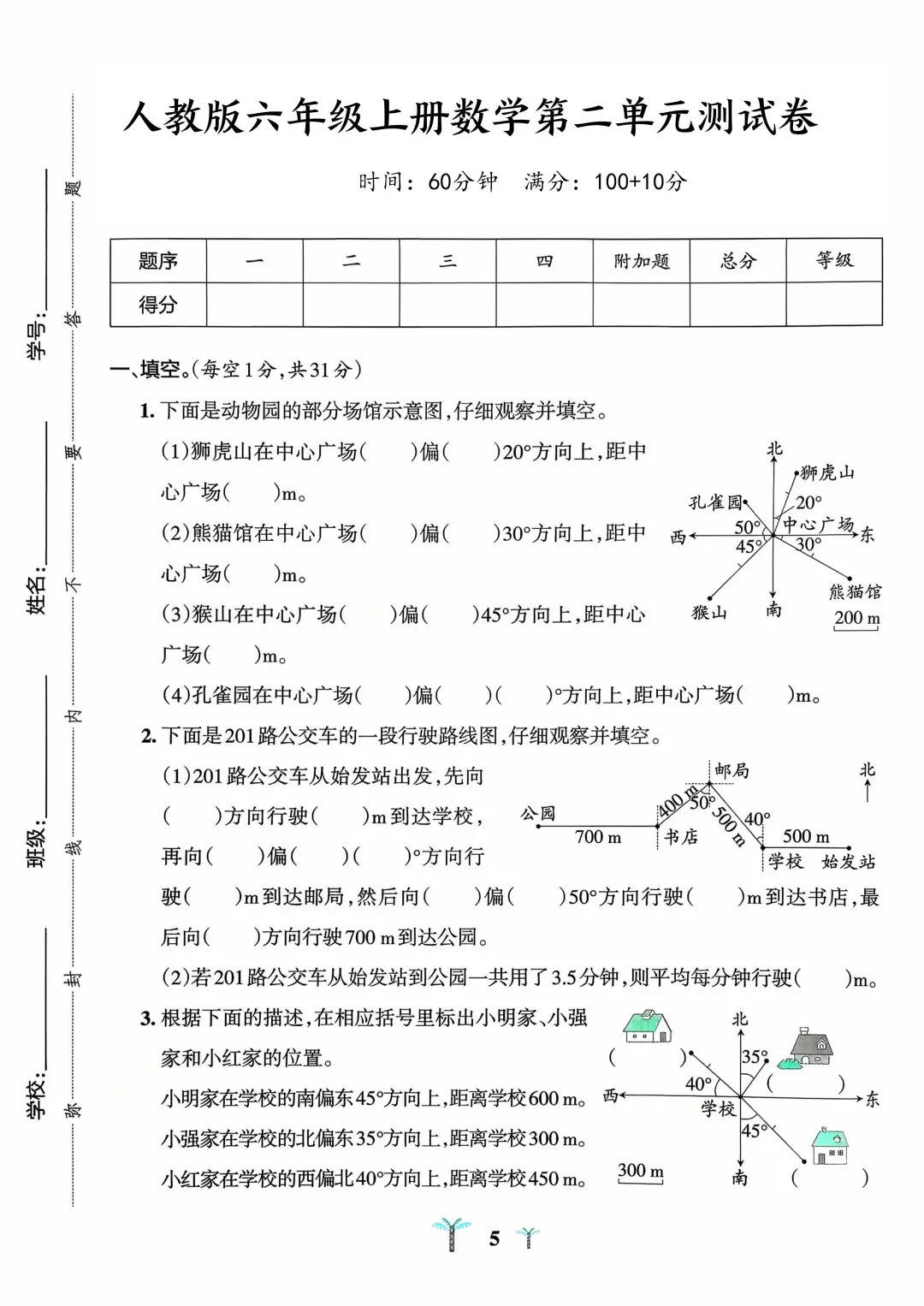 六年级是数学知识整合与综合运用的关键阶段,分数的运算、比的应用、位置与方向的判断等都是重点难点。填空、判断、选择题能帮助学生夯实基础,理清概念,比如区分分数与比、掌握比的基本性质、明确位置与方向的表述等;计算题型锻炼学生的运算能力,确保分数、比的运算准确无误;动手操作题(如根据描述标位置、画路线图)培养空间观念与几何直观能力;解决问题则结合实际情境,提升学生运用数学知识解决实际问题的能力。而且试卷融入丰富的文化与生活元素,让数学学习更有趣味性,同时拓宽视野。通过做这些测试卷,学生能全面检测对知识的掌握情况,查漏补缺,熟悉考试题型,提升应试能力,轻松应对单元检测、期中与期末测试,是六年级数学学习与复习的绝佳好帮手~