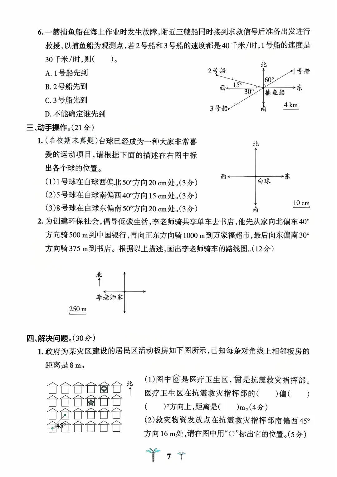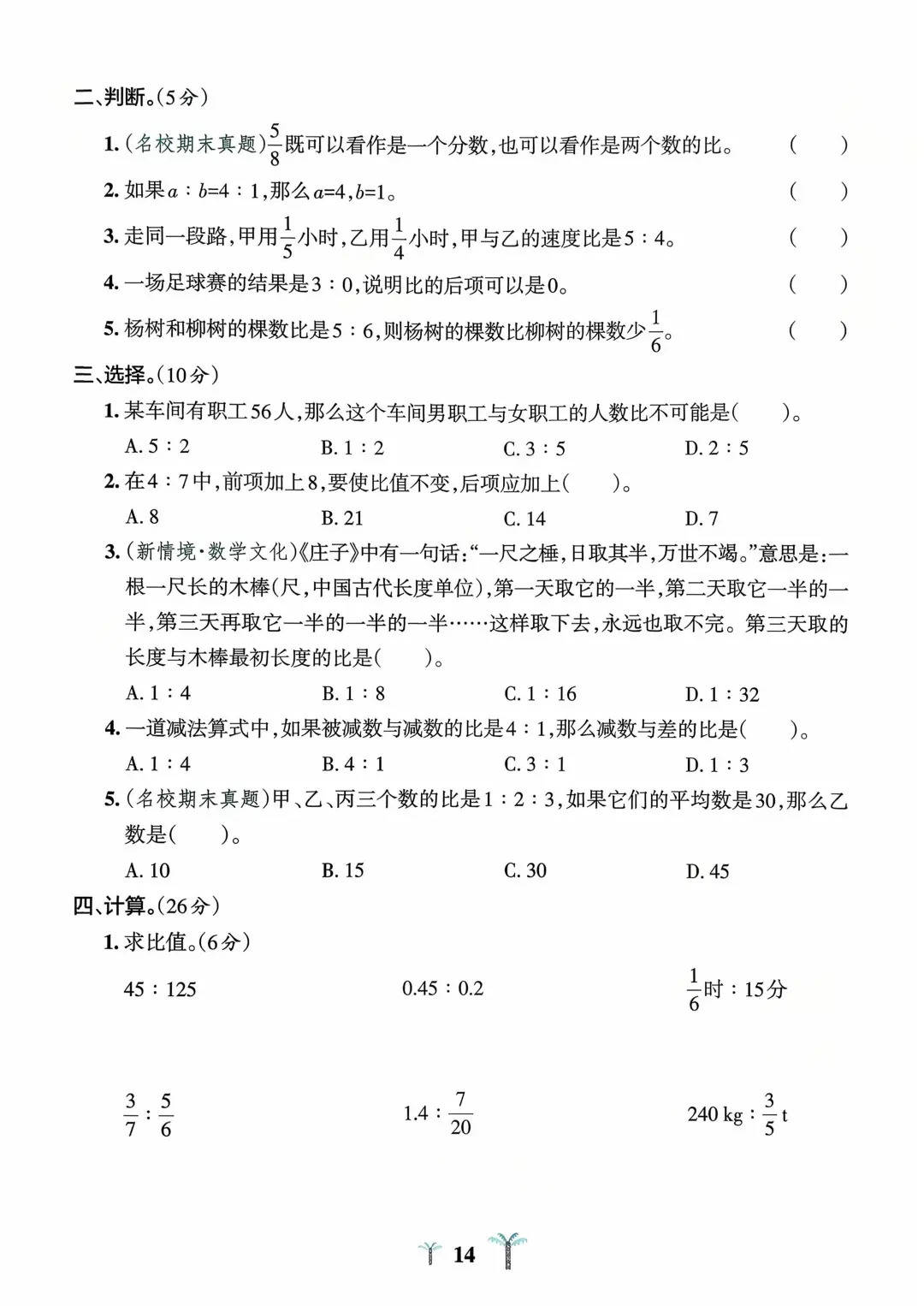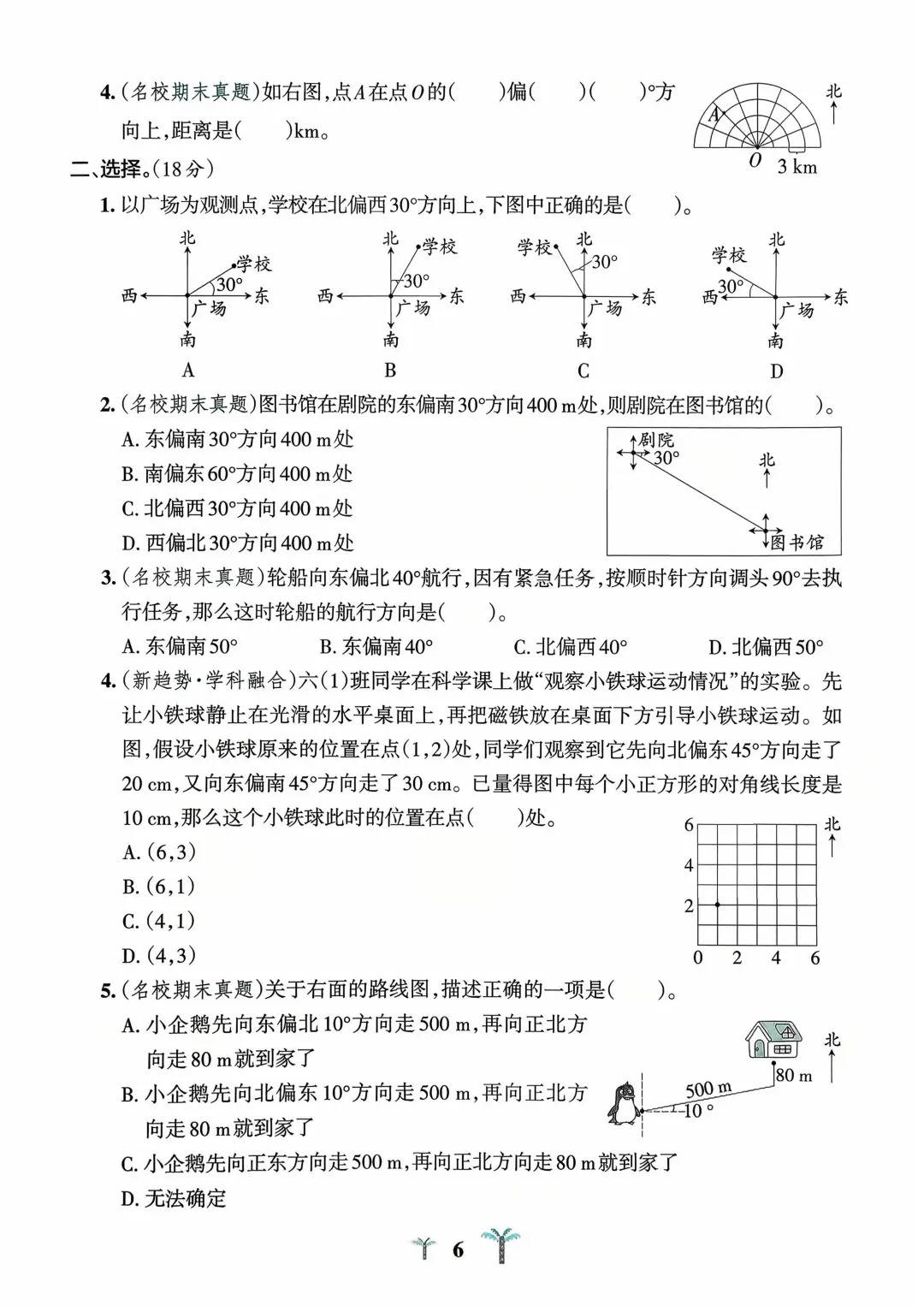 六年级是数学知识整合与综合运用的关键阶段,分数的运算、比的应用、位置与方向的判断等都是重点难点。填空、判断、选择题能帮助学生夯实基础,理清概念,比如区分分数与比、掌握比的基本性质、明确位置与方向的表述等;计算题型锻炼学生的运算能力,确保分数、比的运算准确无误;动手操作题(如根据描述标位置、画路线图)培养空间观念与几何直观能力;解决问题则结合实际情境,提升学生运用数学知识解决实际问题的能力。而且试卷融入丰富的文化与生活元素,让数学学习更有趣味性,同时拓宽视野。通过做这些测试卷,学生能全面检测对知识的掌握情况,查漏补缺,熟悉考试题型,提升应试能力,轻松应对单元检测、期中与期末测试,是六年级数学学习与复习的绝佳好帮手~