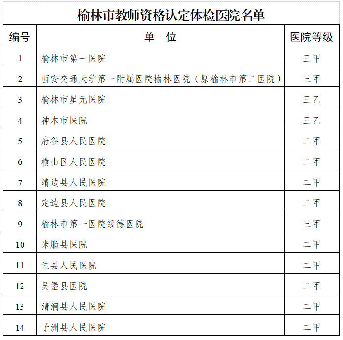 5.榆林市教师资格认定体检医院名单详见下表,其他医院体检的一律不予认定。
