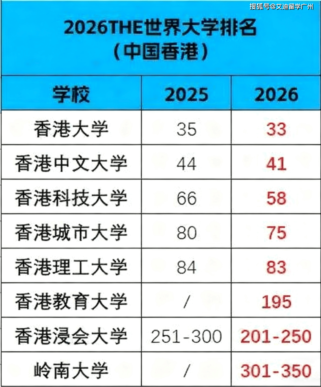 香港大学位列世界第33名,较去年的第35位有所提升。香港教育大学和岭南大学为今年新上榜。