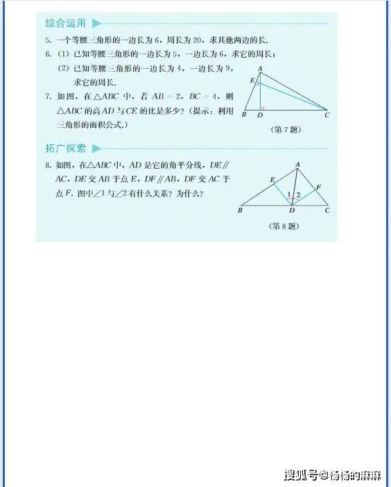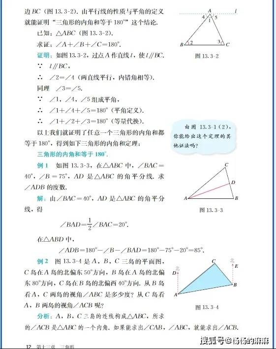 - 等腰三角形计算:“已知等腰三角形顶角为 80°,求底角”((180°-80°)/2=50°);