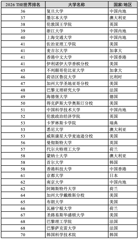 全球36—70位名校分别是: