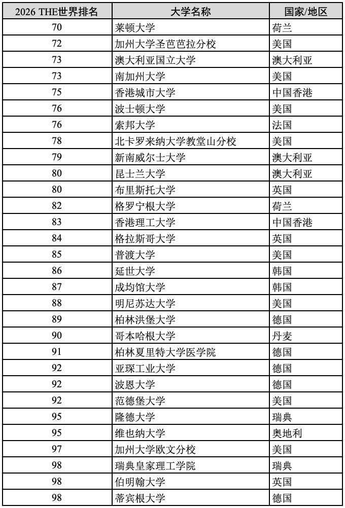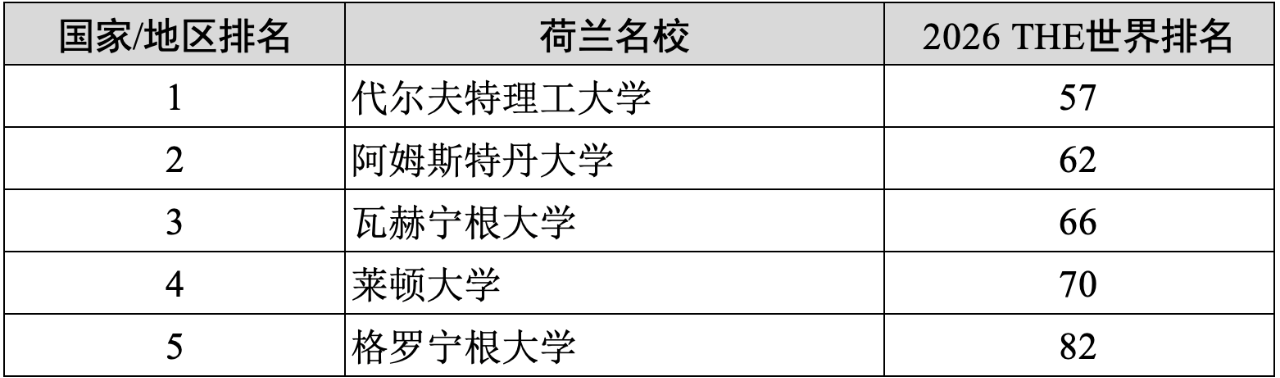 2)荷兰(5所):代尔夫特理工大学(57)、阿姆斯特丹大学(62)、瓦赫宁根大学(66)、莱顿大学(70)、格罗宁根大学(82)。