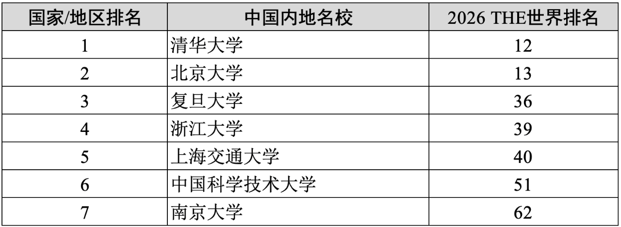 清华大学(12)、北京大学(13)、复旦大学(36)、浙江大学(39)、上海交通大学(40)、中国科技大学(51)、南京大学(62)。