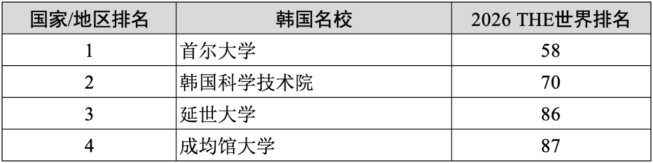 4)韩国(4所):首尔大学(58)、韩国科学技术院(70)、延世大学(86)、成均馆大学(87)。