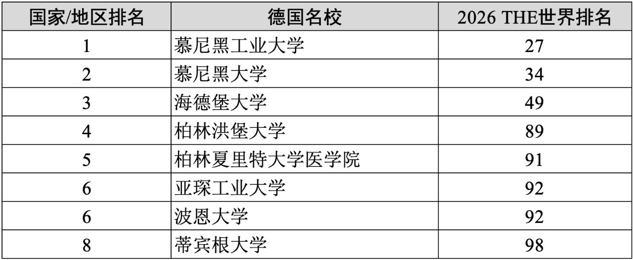 1)德国(8所):慕尼黑工业大学(27)、慕尼黑大学(34)、海德堡大学(49)、柏林洪堡大学(89)、柏林夏里特大学医学院(91)、亚琛工业大学(92)、波恩大学(92)、蒂宾根大学(98)。