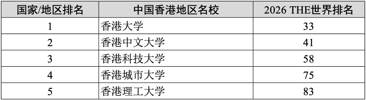 香港大学(33)、香港中文大学(41)、香港科技大学(58)、香港城市大学(75)、香港理工大学(83)。