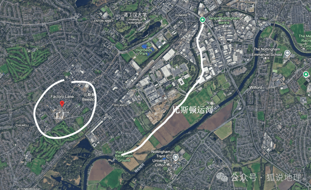 英国随着工业革命的发展,生产的物资对交通的需求越来越大,那个时代由于没有铺设平坦的公路,马车在坑洼不平的土路或者碎石路上的行驶速度较慢,运量又少,尤其在雨季,道路泥泞甚至中断,这就催生了运河运输。因为河流上船只与水的摩擦力较小,这样就可以大大提高运量和运速,英国兴起运河修建的热潮,诺丁汉也如此,修建了诺丁汉运河,其中包括比斯顿运河段,在18世纪末竣工,主要是因为特伦特河在特伦特桥段水浅,船只易搁浅。比斯顿运河从特伦特河上游进入,经过诺丁汉市,跟另外一条运河汇合后,在下游进入特伦特河。当时主要运输的物资是煤炭,主要运往外地,还有铅、铜、砾石、路石、肥料、纺织品蕾丝。比斯顿运河早在1946年就停运了。诺丁汉是蕾丝生产中心,不是农具、五金中心。这些工厂也没有沿比斯顿运河修建。