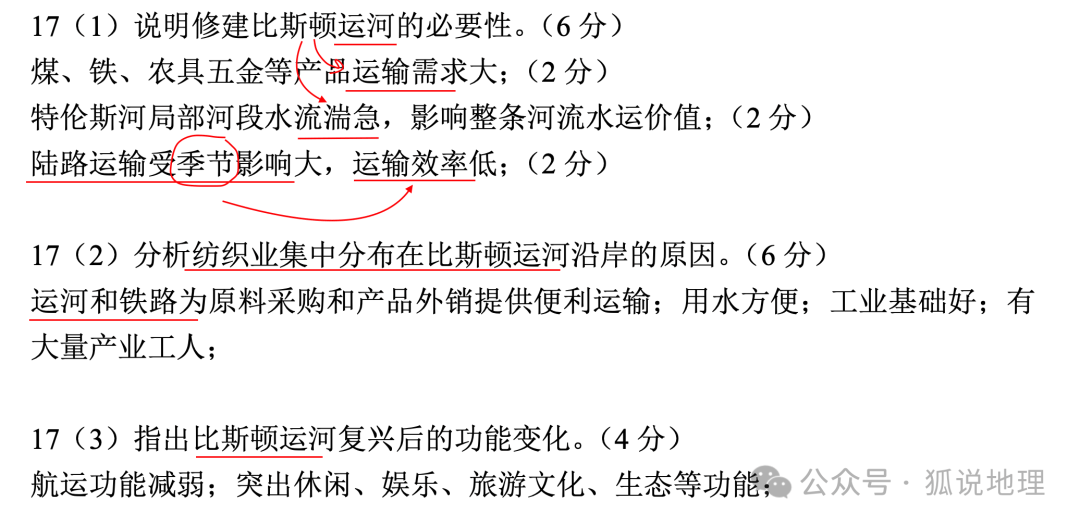题干:“17 世纪末,该地成为煤、铁等矿产开采地和农具、五金等生产中心。”高考题问“修建比斯顿运河的必要性”,对应答案:“煤、铁、农具五金等产品运输需求大; (2 分)”