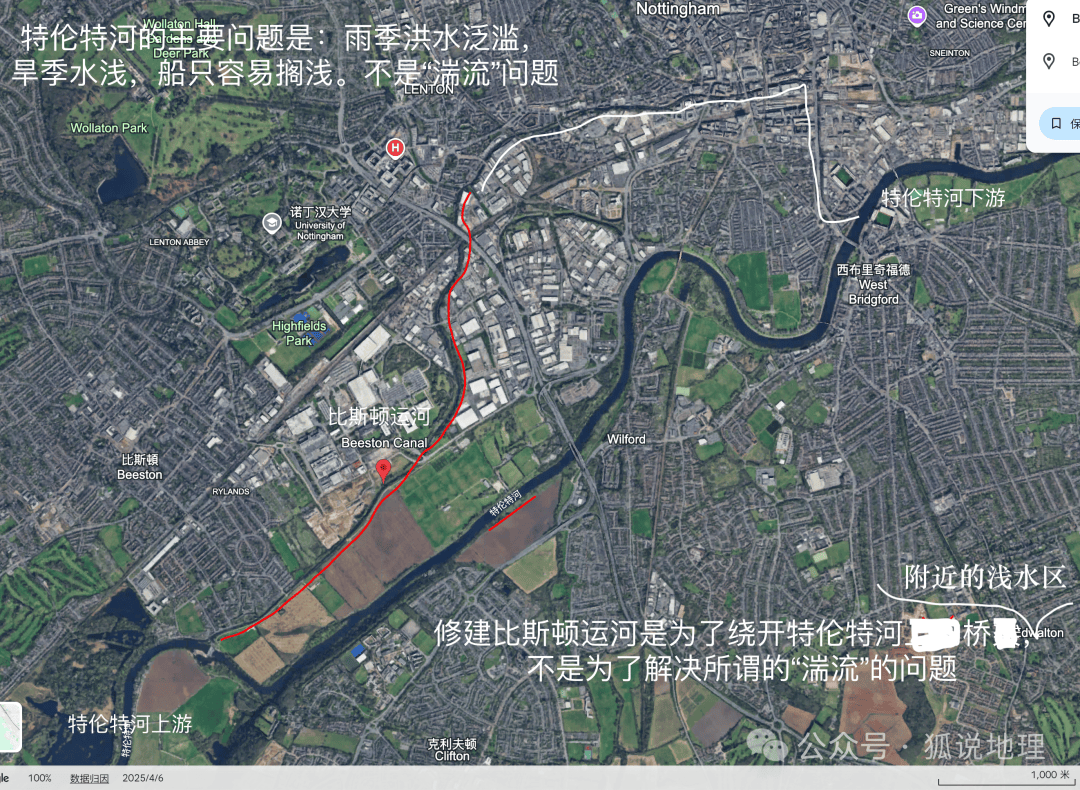 “在运河主线由其所有者建造的同时,独立的特伦特航运公司修建了比斯顿水渠,从诺丁汉伦顿的主线重新汇入诺丁汉上游的特伦特河,从而绕过了特伦特桥的航行困难段”,“这样,河上的交通就可以绕过通行困难的特伦特桥,并通过诺丁汉的码头。”