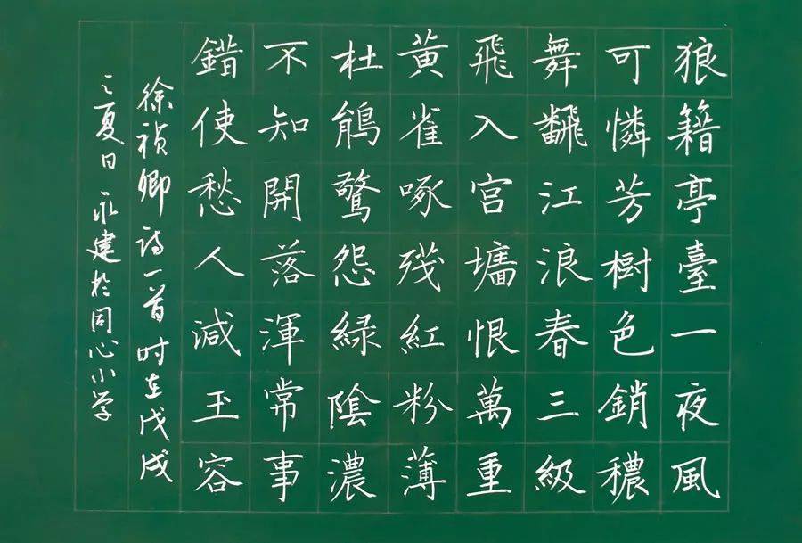 可见,粉笔字的内外聚散对比既是又一解决笔画排列均匀问题的手段,又是形成字形美观的条件。强化内紧外松练习,利用米字格和回宫格来训练十分奏效。