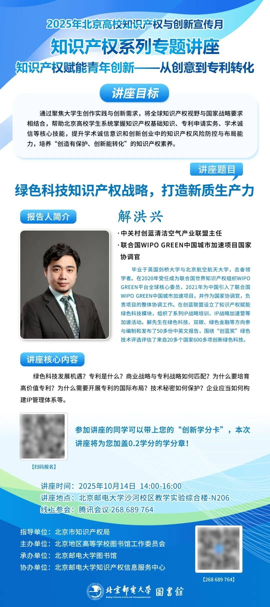 通过聚焦大学生创作实践与创新需求,将全球知识产权视野与国家战略要求相结合,帮助北京高校学生系统掌握知识产权基础知识、专利申请实务、学术诚信等核心技能,提升学术诚信意识和创新创业中的知识产权风险防控与布局能力,培养“创造有保护、创新能转化”的知识产权素养。
