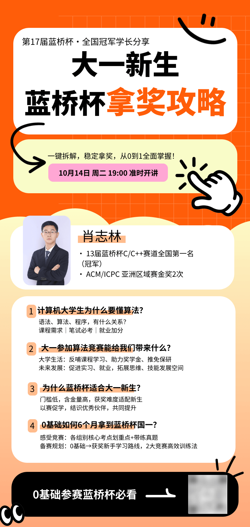 如果你也有这些问题,那今晚7点,你一定要抽90分钟时间来云课直播间,因为蓝桥杯曾经的🏆全国冠军(国一 第一名)学长 肖志林要来为大家传授“大一新生蓝桥杯拿奖攻略”啦!!蓝桥杯比什么?怎么比?直播中,统统会告诉大家👇