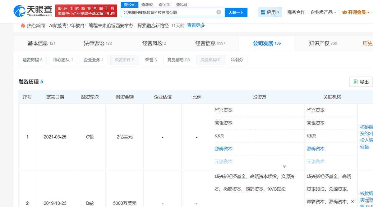 同时,据天眼查APP显示,北京聪明核桃教育科技有限公司(“核桃编程”)现在已经完成了五轮融资,投资方包括华兴资本、高瓴资本等,融资金额总计超3亿美元,整体表现也非常亮眼。
