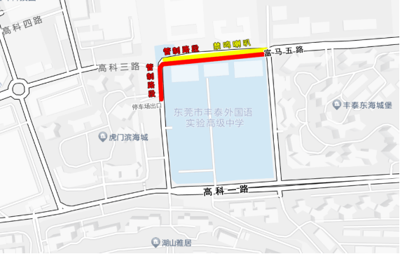 (二)富马五路校园周边至滨海城地下车库出口路段实施临时交通管制,禁止机动车、非机动车通行;富马五路校园周边路段禁鸣喇叭。