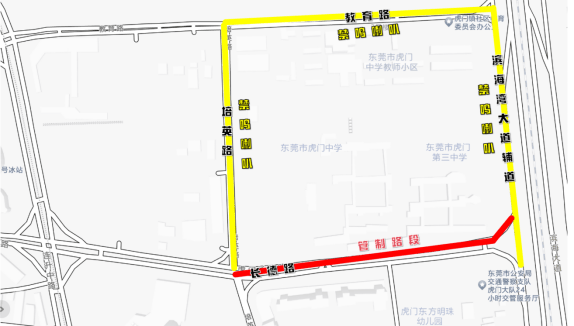 (一)长德路单向路段(与滨海湾大道交界路口至与培英路交界路口)实施临时交通管制,禁止机动车、非机动车通行;长德路、教育路、培英路、滨海湾大道校园周边路段禁鸣喇叭。