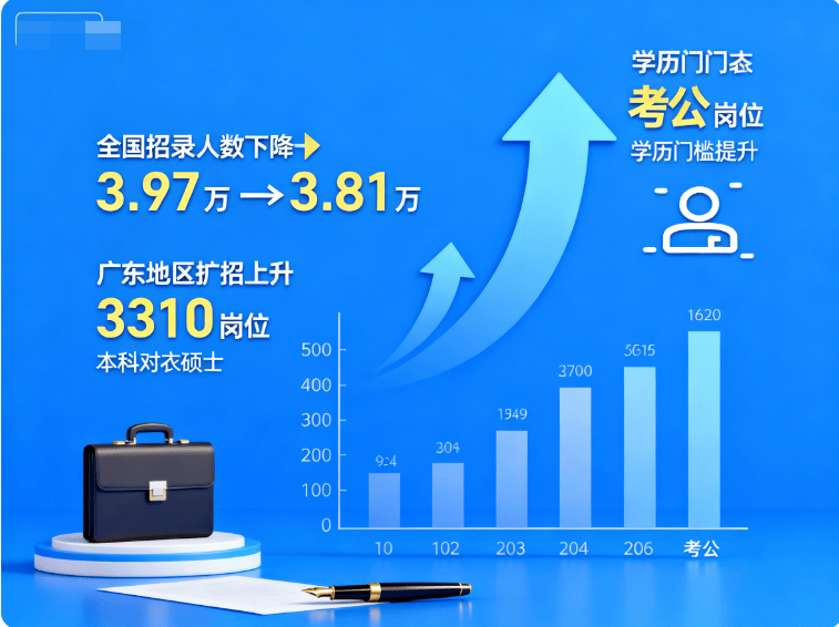 2026 年国考报名正式启动,但这次的画风明显不一样了! 总招录人数从去年的 3.97 万缩减至 3.81 万,近八年首次 “刹车”。然而,广东却逆势扩招,以 3310 个岗位领跑全国,堪称 “考公福地”。与此同时,学历门槛悄悄抬高,30 多个热门岗位从 “本科可报” 变成 “仅限硕士”,让不少考生直呼 “选岗即结束”。这届国考究竟释放了哪些信号?
