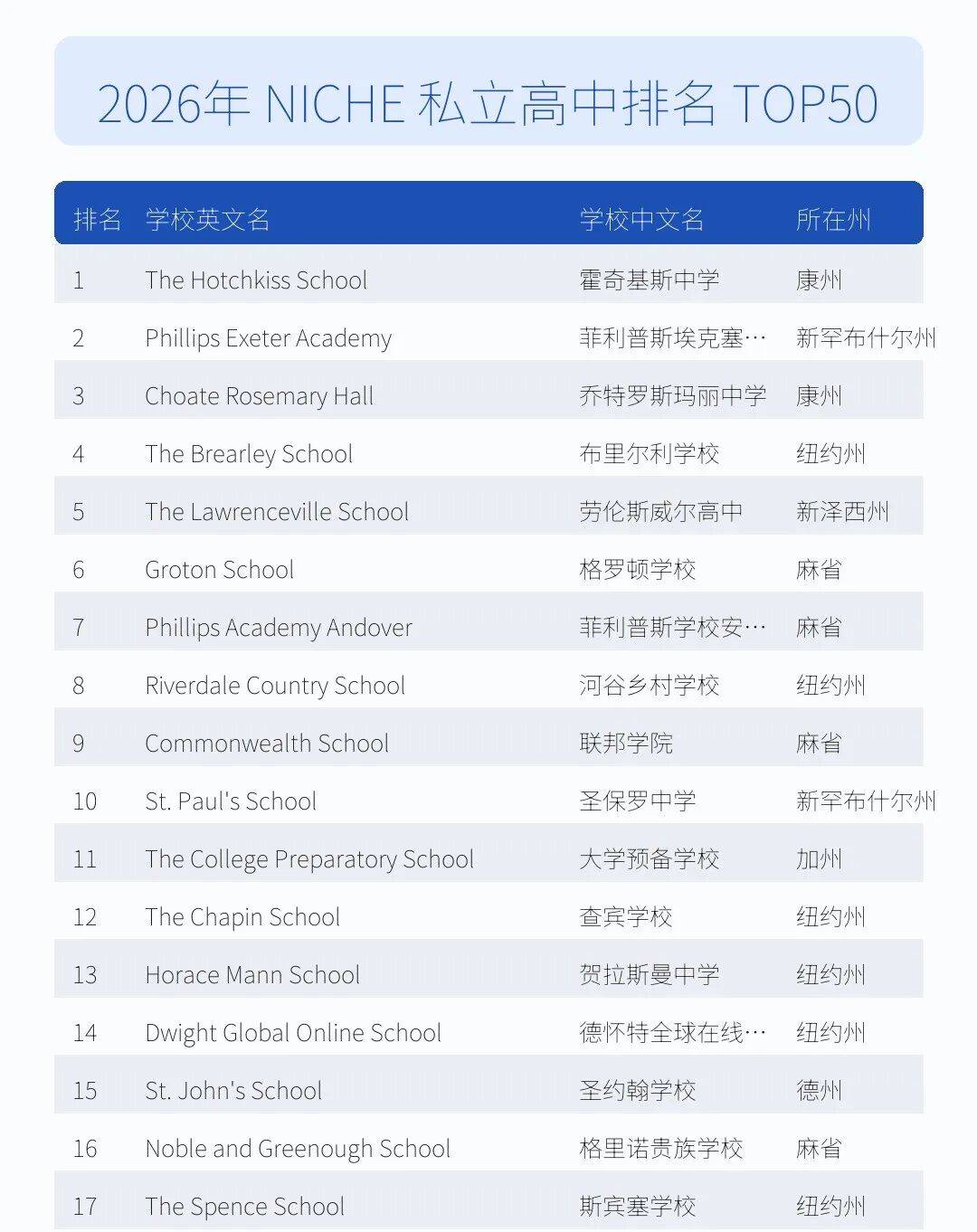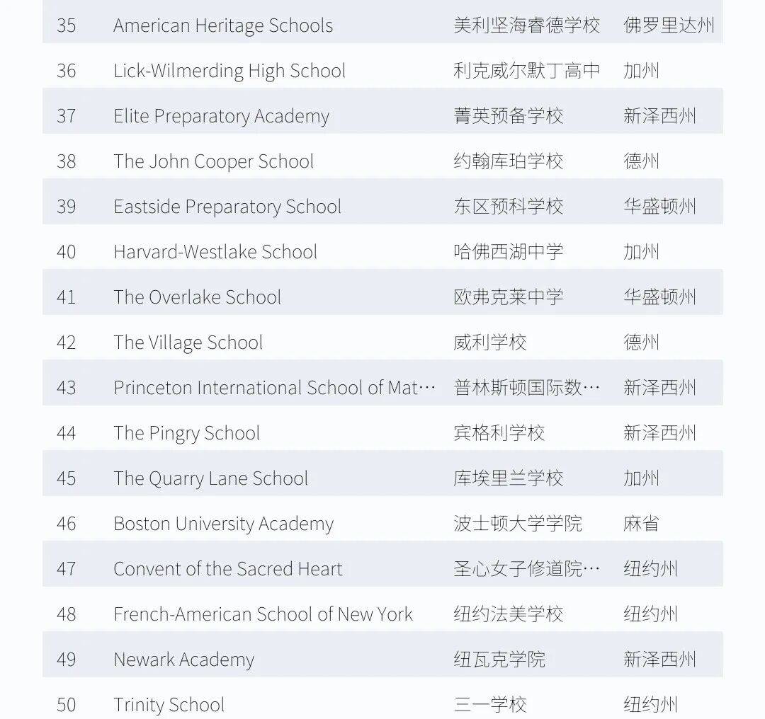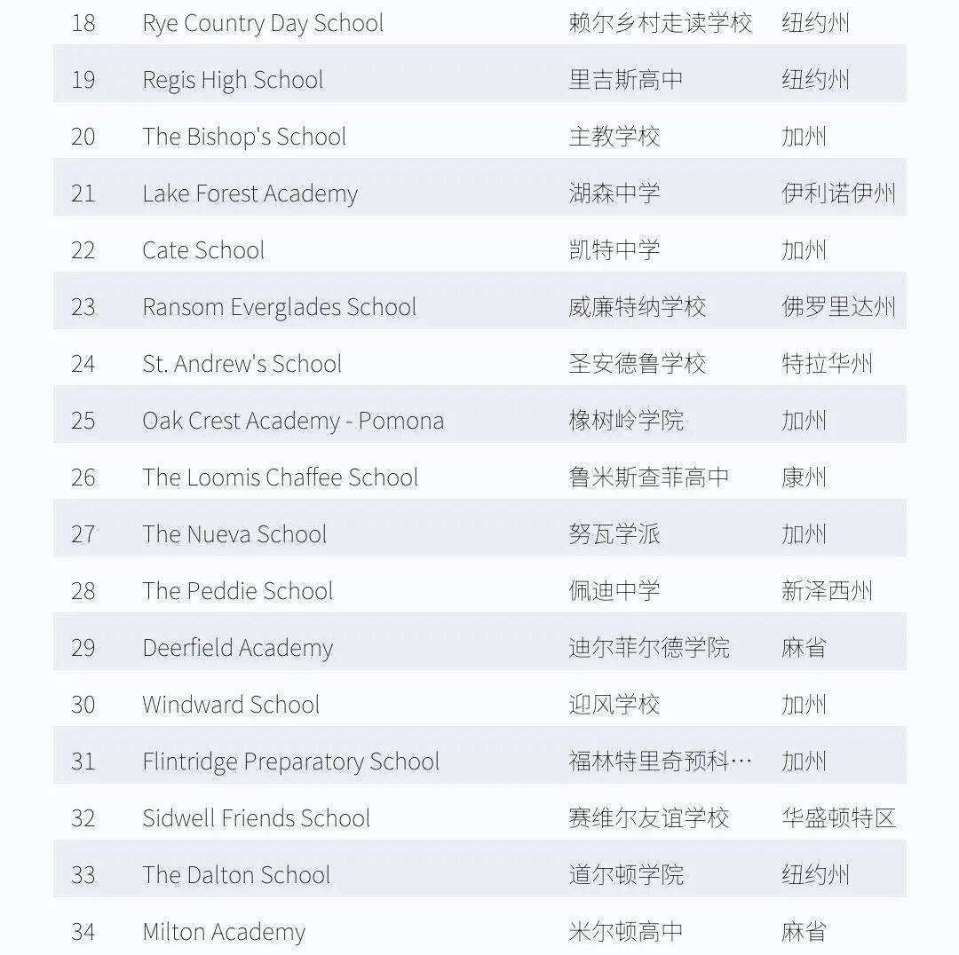 劳伦斯威尔高中(Lawrenceville)从第16名强势跻身前五(第5名);布里尔利学校(Brearley)从第13名升至第4名;著名的名校菲利普斯学校安多佛(Phillips Academy Andover)从第2名滑落至第7名,退出前五,传统顶尖校座次迎来重构。
